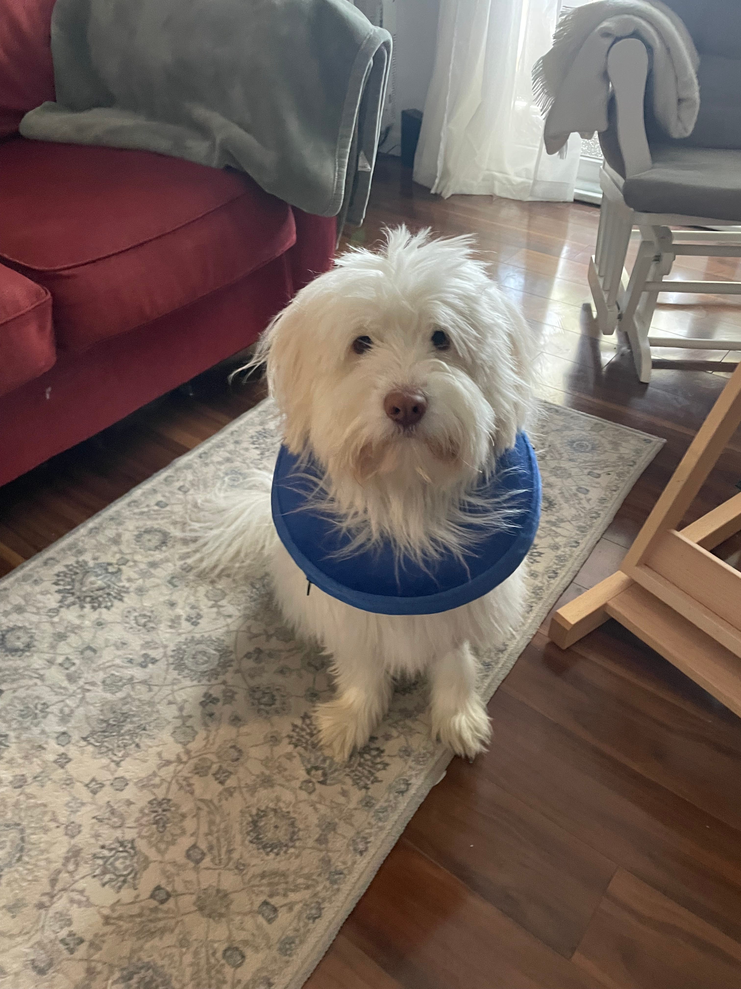 They did a wonderful job … but Egon wouldn’t stop licking the anasthesia site, so now he has to wear a donut until it heals